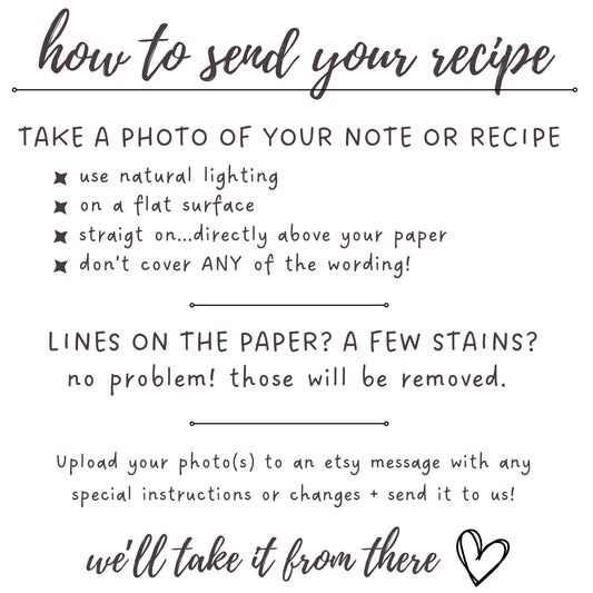 This was the sweetest gift it made my mom cry 🥹 I was worried about the quality of the text on the recipes I sent over but it c... Read MoreThis was the sweetest gift it made my mom cry 🥹 I was worried about the quality of the text on the recipes I sent over but it came out perfectly. Highly recommend this product! HidePosted onLauren TVerified Etsy Customer