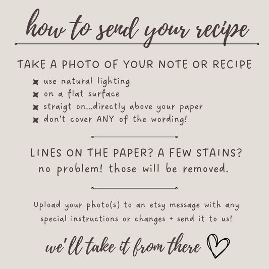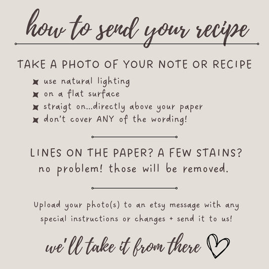 This was a gift for my mom. My gram passed away last May. We found hand written recipes and those alone brought tears to my mom'... Read MoreThis was a gift for my mom. My gram passed away last May. We found hand written recipes and those alone brought tears to my mom's eyes. I wanted to give her something that would last much longer than the dilapidated paper. When she opened her present and saw this cutting board.. the tears just rolled! Happy, joyous tears. WELL done!!!!❤️❤️ HidePosted onBrianna BVerified Etsy Customer