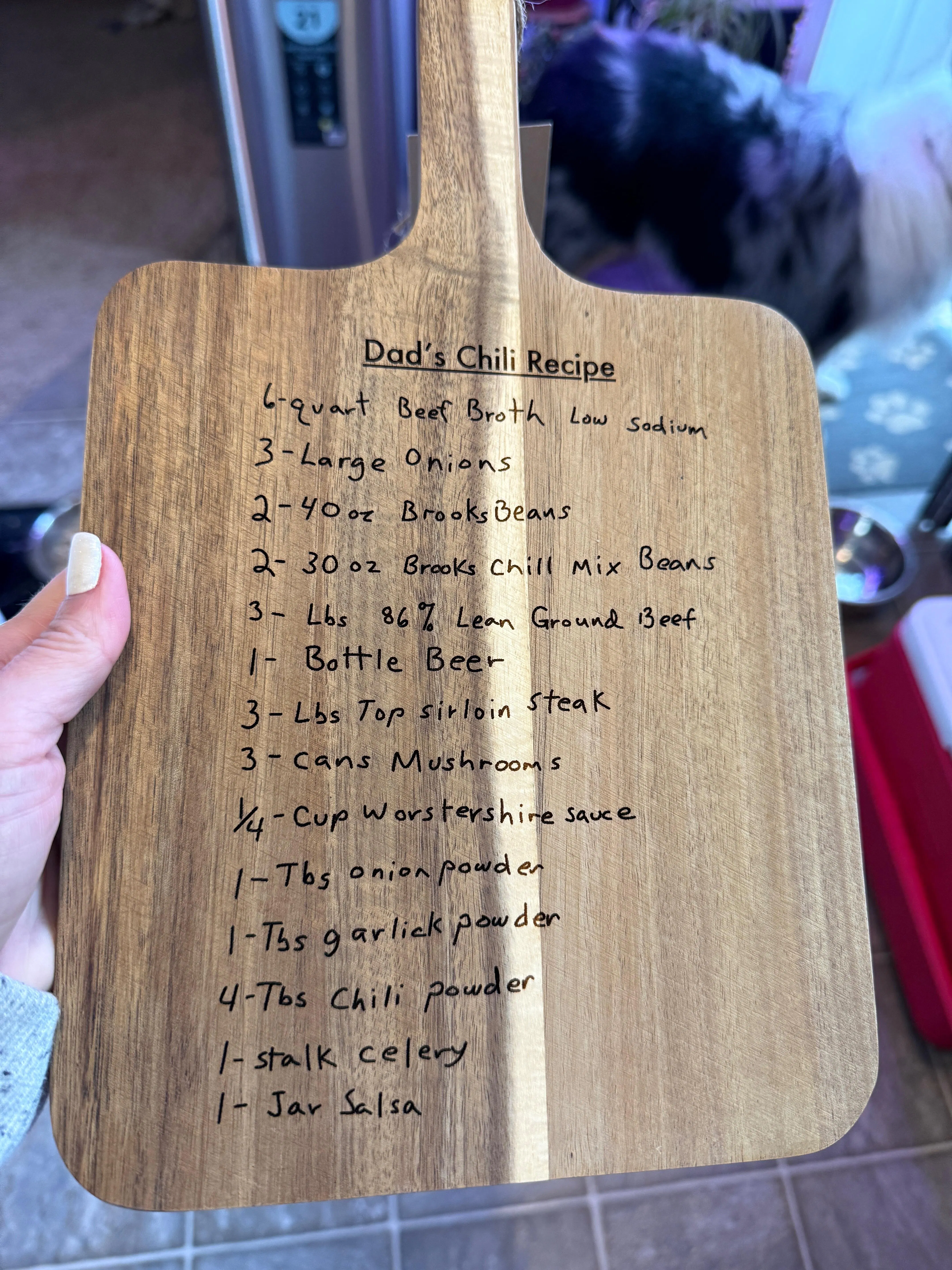This was a Christmas gift for my sister regarding our Dad's famous chili recipe. She loved it so much! The lettering was done so clean and clear. The cutting board is high-quality.